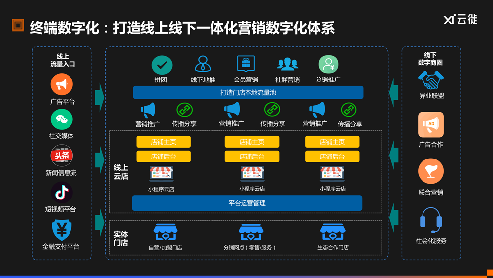 终端数字化:打造线上线下一体化营销数字化体系,顺利获得线上营销触达用户,并在线下给予产品与服务体验。其中的关键是顺利获得与实体门店一一对应的线上云店,实现线上线下流量、营销、会员、推广等方面的互通与融合。