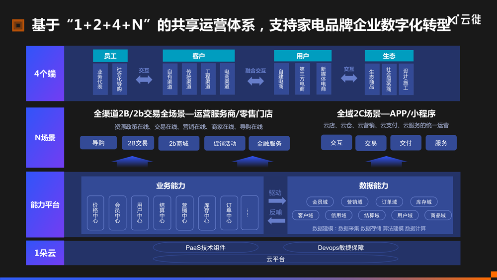 上述的5大数字化能力,最终都会体现在业务场景上,基于此,曾老师的团队总结出了「1+2+4+N」的共享运营体系,以支持家电品牌企业数字化转型。