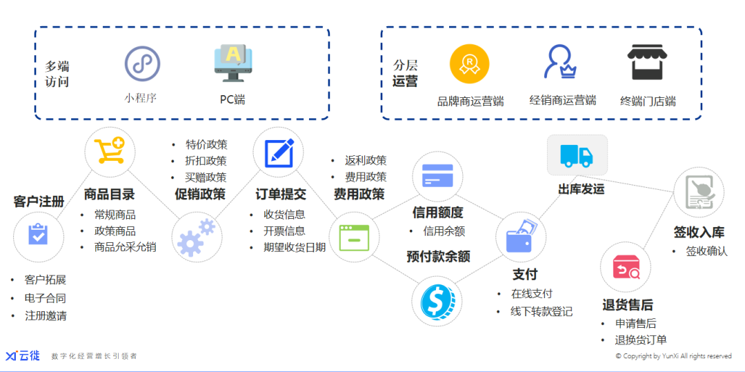 渠道交易在线:搭建线上交易平台,打通终端网点(小B)-经销商(大B)-品牌全链路业务交易。