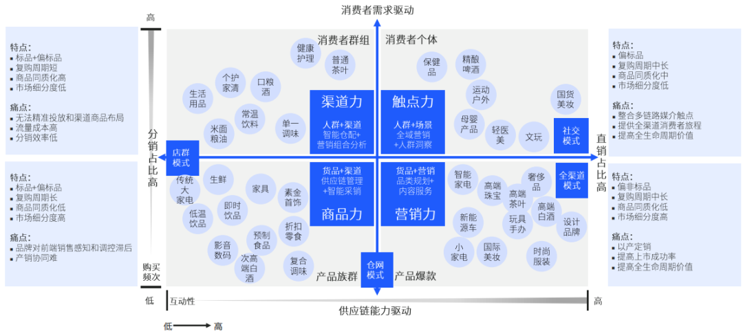 其次,理顺业务驱动力的迁移过程,运营重点从经销商逐步下沉到门店,再到消费者的路径中,重要逐步重点考虑如何提升渠道力、触点力和营销力,确保生意基盘稳固,及资源投入效率提升;其中关于触点力的构建,如何发挥社交小b价值、以及社交电商对创新业务的驱动、锁定高端群体、触达中国低线城市新消费群体、满足Z世代消费群体的需求的作用,是传统消费企业需要思考的问题。